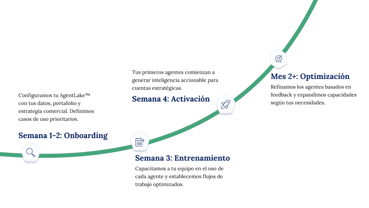 Tu empresa accede a un AgentLake personalizado, un entorno exclusivo de agentes de IA especializados diseñados para operar como una extensión natural de tu equipo de inteligencia comercial y ventas.